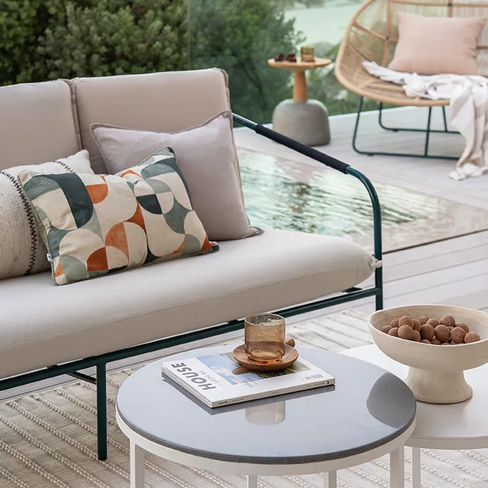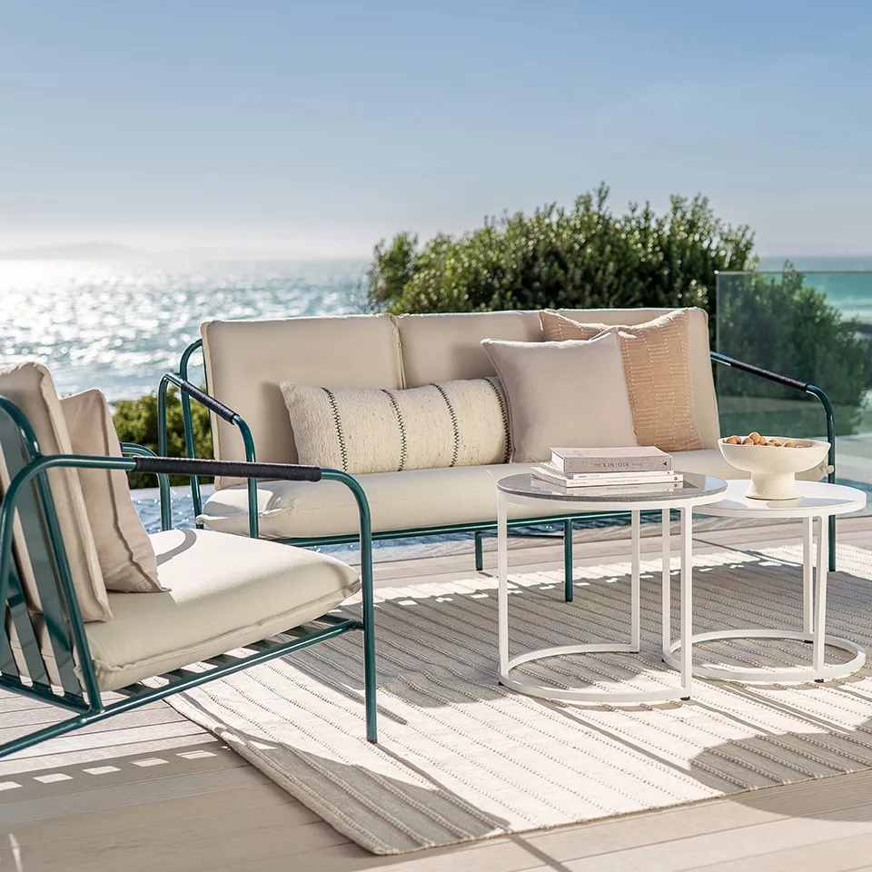 Crafted from gently rounded aluminium tubing and finished here in our rich new Zimbali Green powder coating, Coco’s frame is lightweight, durable, and built to withstand the elements.