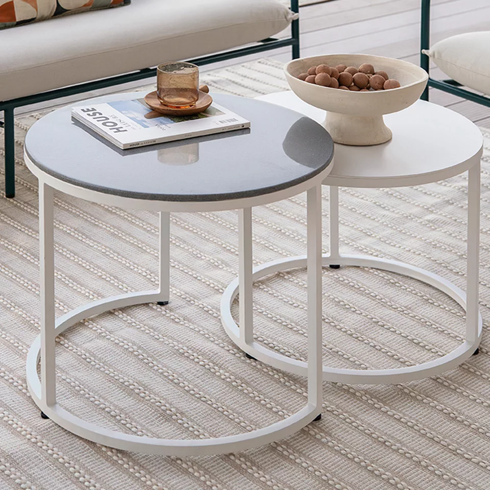 With a sleek aluminium frame and a glossy Aura Stone top, Lebo exudes contemporary charm. Its rounded design adds a touch of elegance, making it equally suitable as side tables or combined to form a stylish coffee table.