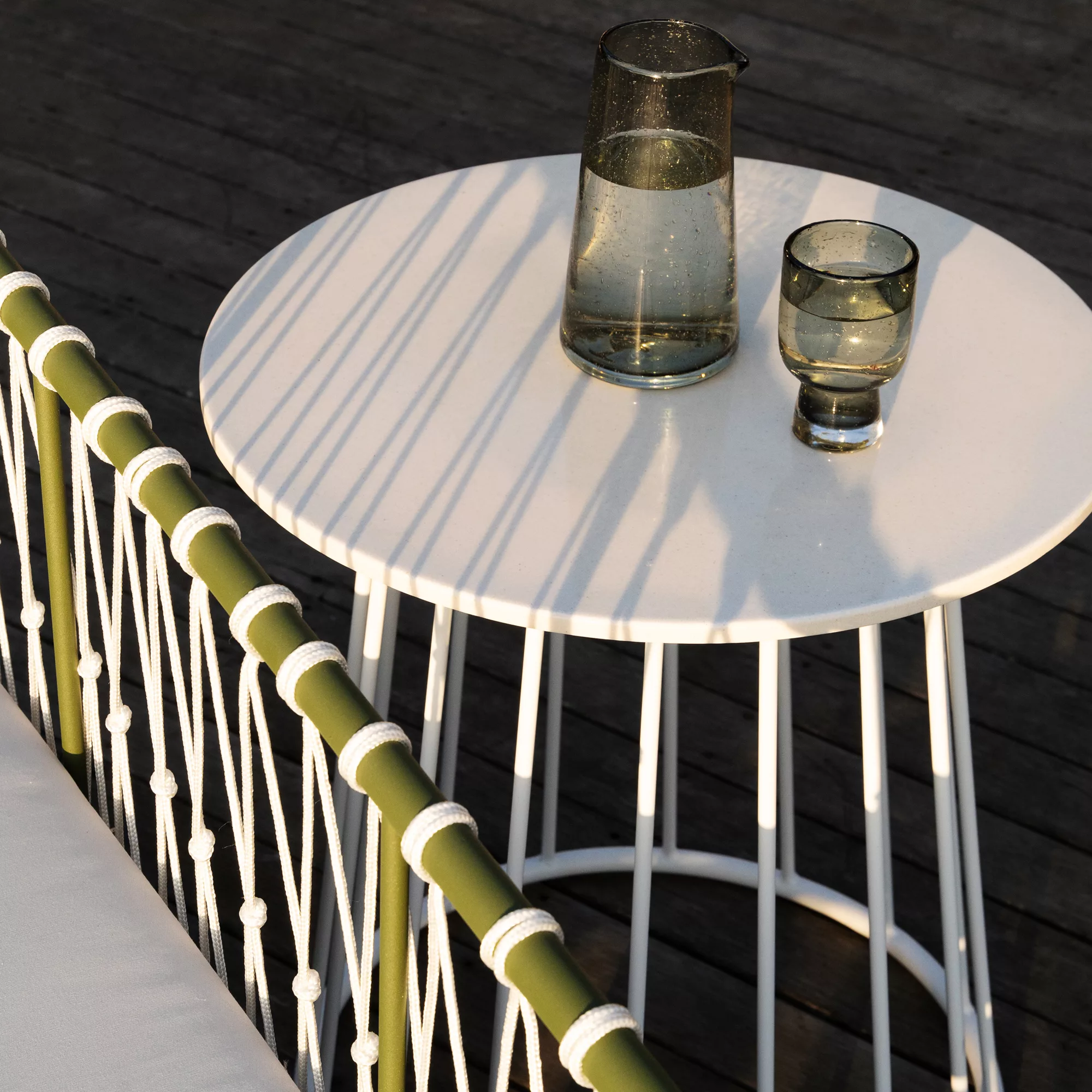 The Savanne Site Table is a perfect blend of style and functionality. Featuring a sleek round design and a glossy Aura Stone top, this table adds a touch of sophistication to any setting. Its wide base tapers to a slender top, adorned with vertical tube detailing for added charm. Delightfully practical and exceptionally good-looking, the Savanne Side Table effortlessly complements any furniture arrangement, making it a versatile and stylish addition to your outdoor oasis.