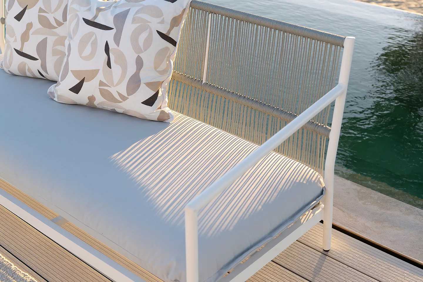Tailored cushions with pleated edging provide comfort with luxury finish. The slim aluminium frame is lightweight, low-profile, and powder-coated in the colour of your choice.