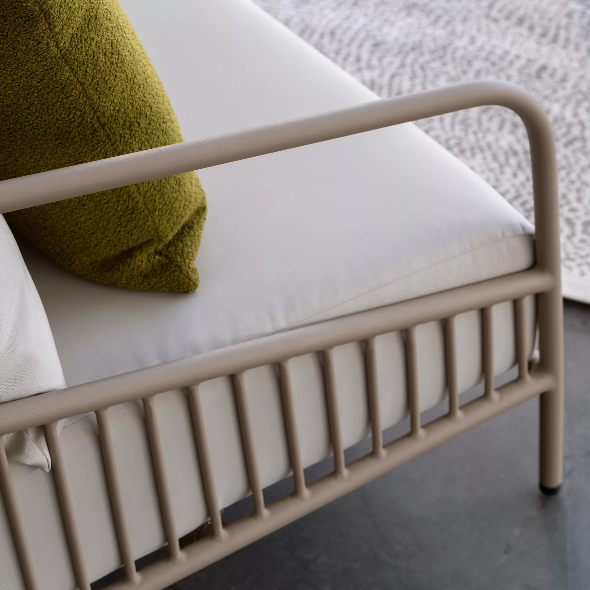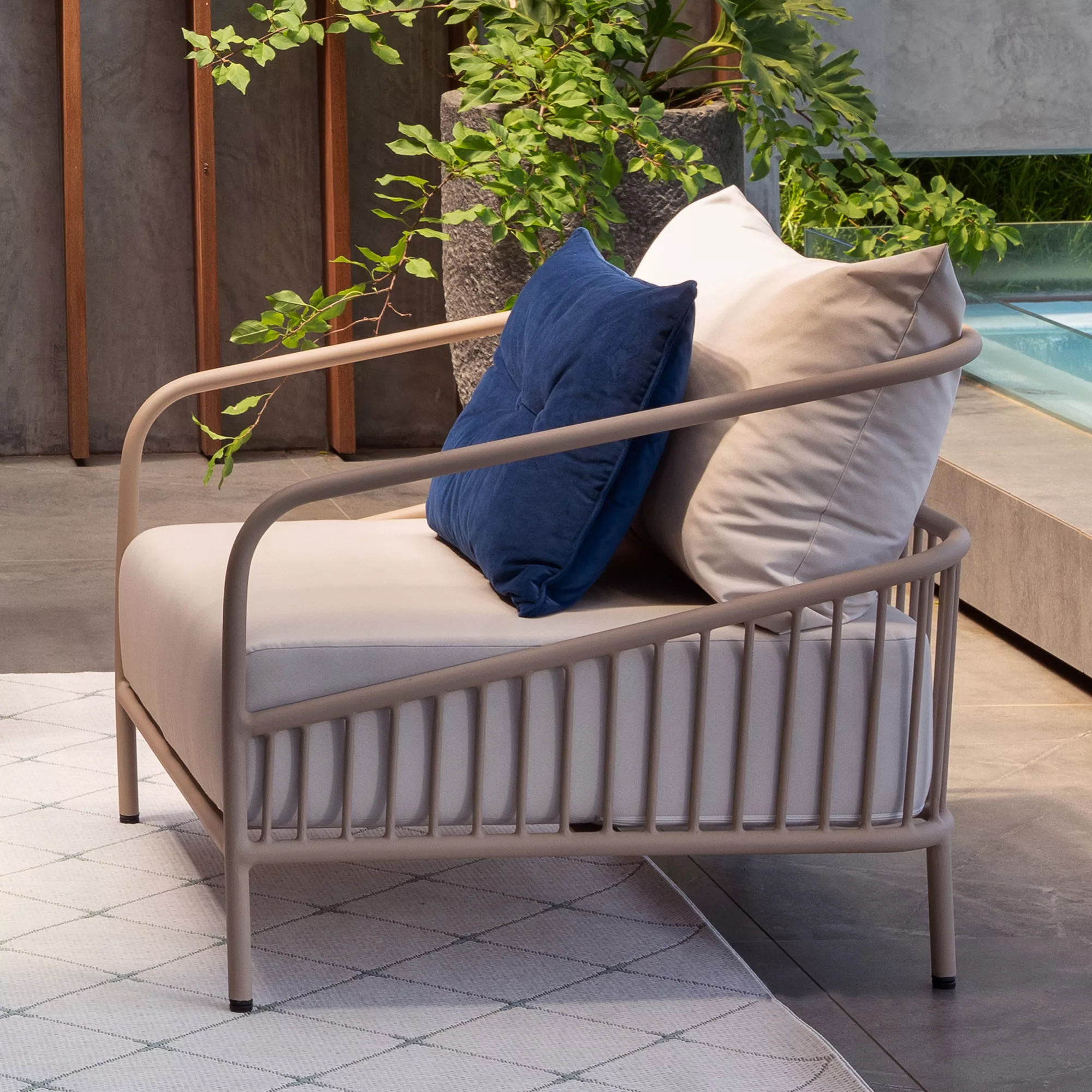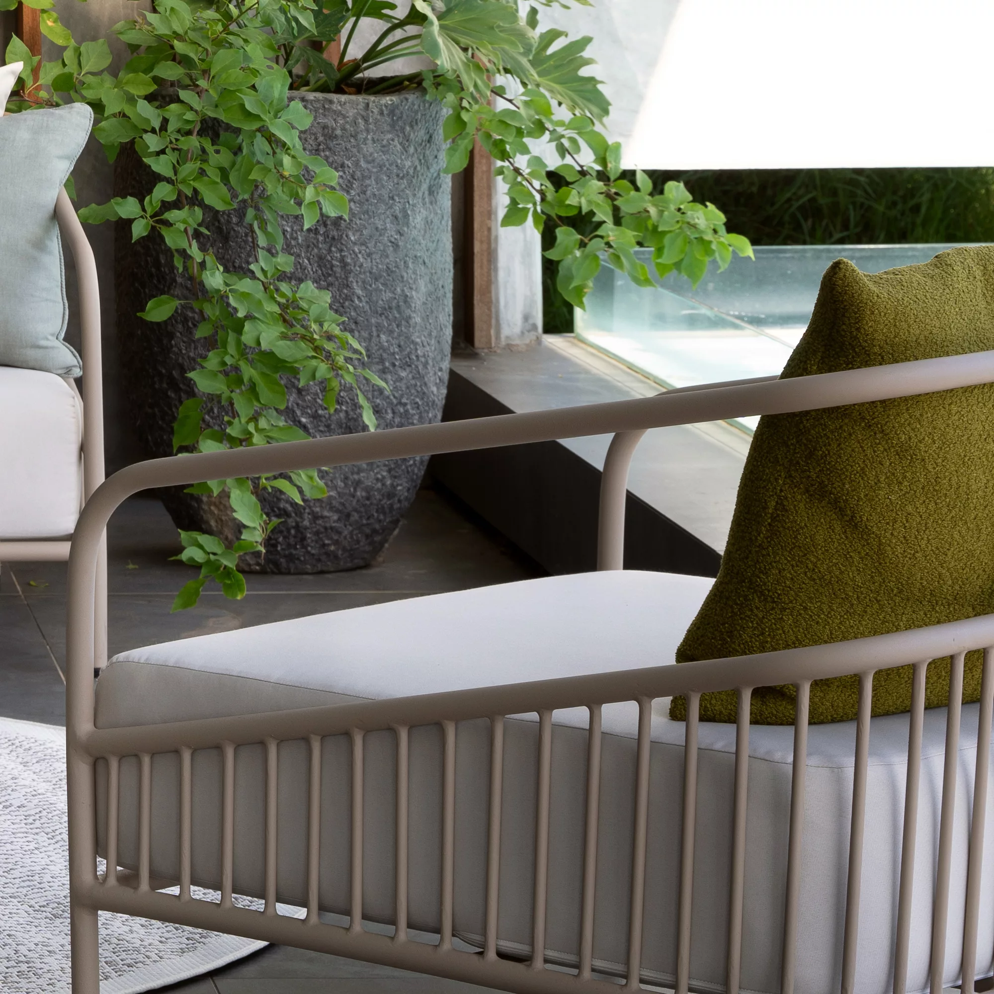 Crafted with an all-aluminum frame featuring a durable powder-coated finish, Tara ensures longevity and timeless style. Its contemporary design boasts rounded corners and thicker round tubing for added sturdiness. Vertical slats, made from thinner tubing, create intricate detailing, enhancing its visual appeal.